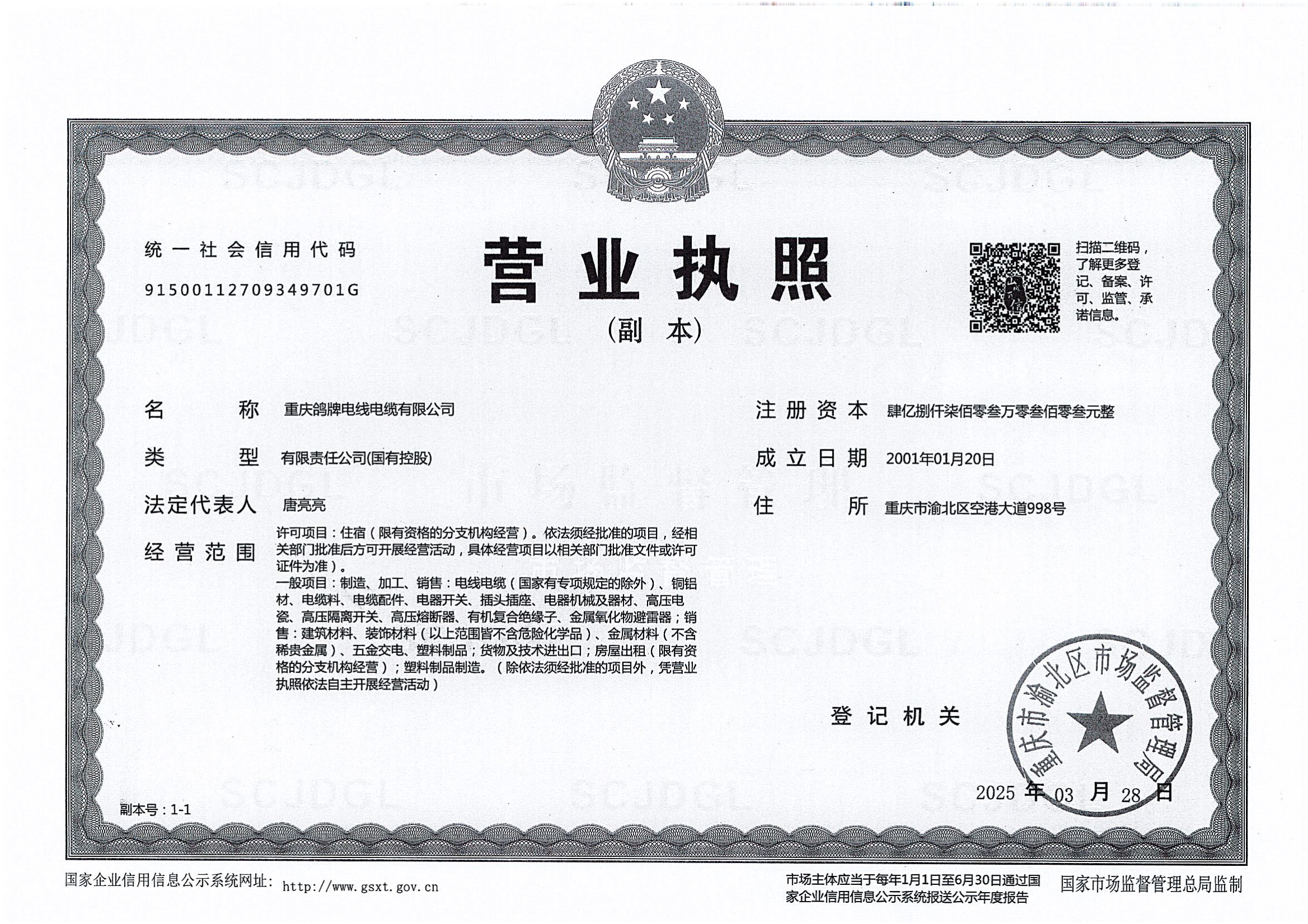 重慶鴿牌電線電纜有限公司,隸屬于港交所上市的重慶機電股份有限公司,系全國電線電纜行業(yè)重點國有控股企業(yè)。公司始建于1956年,60多年專注于電線、電纜、銅型材、高壓電瓷、塑膠管材的研發(fā)和生產(chǎn),一直致力于打造水電一體化產(chǎn)品結構,為國際國內航天航空、軌道交通、發(fā)電機組、輸配電工程配套及家裝系列提供了安全、節(jié)能、環(huán)保產(chǎn)品和優(yōu)質服務。